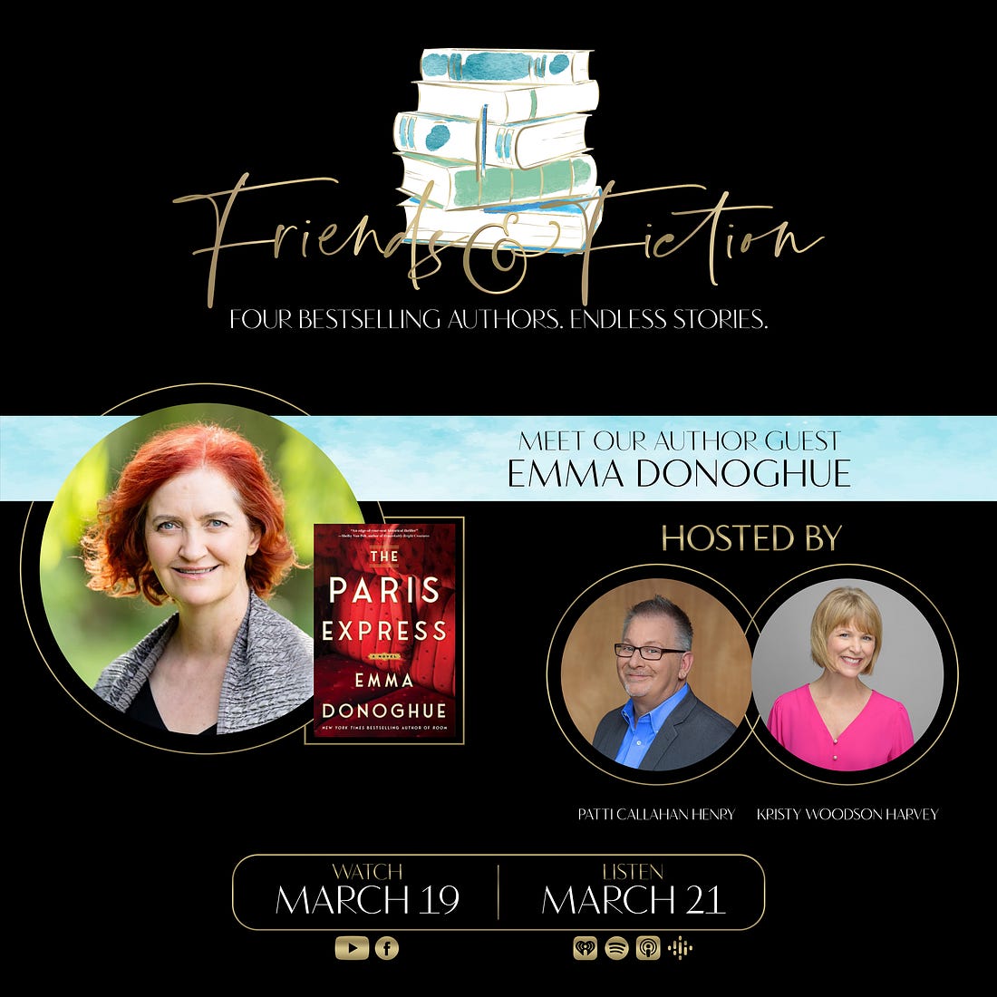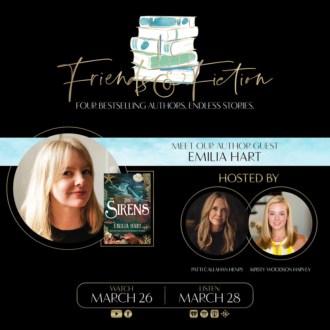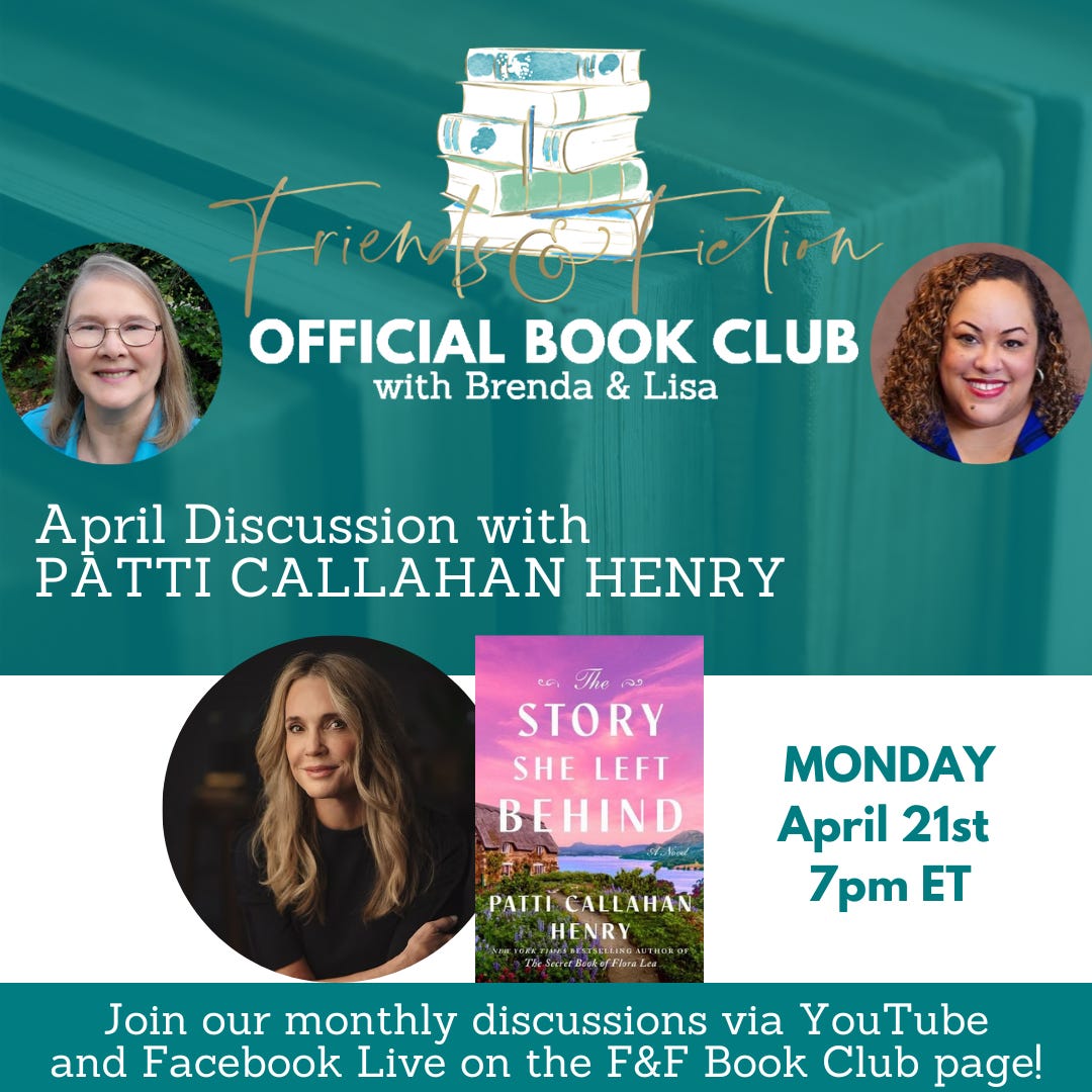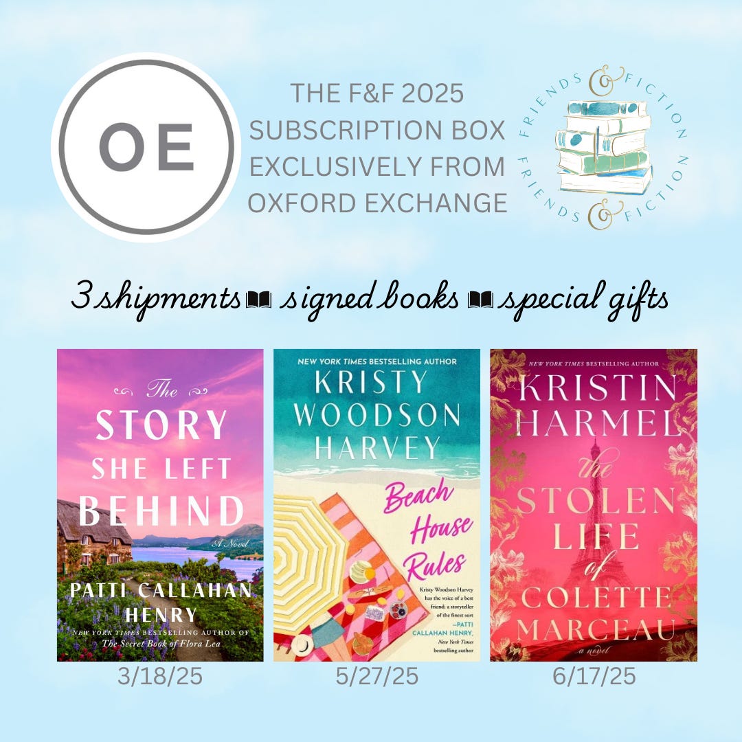 Tune in at 7pm ET for TONIGHT’s episode! Join us Wednesday, March 26th at 7pm Eastern on the F&F Facebook page and YouTube channel as Patti Callahan Henry & Kristy Woodson Harvey welcome New York Times bestselling author Emilia Hart to discuss her latest spellbinding novel, The Sirens, about sisters separated by centuries, but bound together by the sea. An Australia native now living in England, Emilia has worked as a lawyer in Sydney and London. She is the author of the runaway NYT-bestselling debut novel, Weyward. She joins us to discuss her highly anticipated second novel, The Sirens. It’s a breathtaking tale of female resilience and the bonds of sisterhood across time and space, which captures the power of dreams, and the mystery and magic of the sea. Watch the video broadcast of this interview as it airs Wed 3/26 at 7pm ET on the F&F Facebook group page & YouTube channel. Catch the audio version on our podcast Fri 3/28. Order Emilia’s book on Bookshop.org! Upgrade to our PAID Subscription for bonus Q&A’s with our guest authors which include a writing tip, book recommendation, and information about their works-in-progress, plus other great material not covered on the show! Latest News from the Fab Four!PATTI CALLAHAN HENRY has been on the road all week for THE STORY SHE LEFT BEHIND and loving every second of meeting readers, signing books, being with her F&F family and seeing old friends. The F&F gathering in Atlanta started the week with a BANG and she is traveling with Meg Walker through 7 states over the last days and next few. Patti is over the moon grateful for everyone’s love and support during publication week. She is on the road for three more weeks so check HERE if there is somewhere you can see her including a special event with her narrator Julia Whelan in Pasadena, California! Follow along on Instagram and join us on the road. KRISTY WOODSON HARVEY is gearing up BIG TIME for her upcoming tour dates! The official BEACH HOUSE RULES tour begins on May 26, but, between now and then, there are so many chances to catch her in person and virtually, beginning on April 3 with a fun event with Viola Shipman, Annabel Monaghan, and Brendan Slocumb! And tickets are selling quickly for her 10-year author anniversary celebration, on May 5, 2025 with South Park Magazine in Charlotte. She is also so thrilled that BEACH HOUSE RULES got the most magical Publisher’s Weekly review! They said: “Harvey keeps the twists and turns coming with her well-constructed plot, including a shocking development on the charges Bill faces. This first-rate tale is perfect for summer reading.” I’m so honored! KRISTIN HARMEL has some fun news she's excited to share later today, so stay tuned to her social media… She's also hard at work on her 2026 book and is excited to share her tour for THE STOLEN LIFE OF COLETTE MARCEAU soon… hopefully sometime next week! She spent a great weekend celebrating her 11th wedding anniversary with her husband, Jason, at Ravello (the yummy Italian restaurant at the Four Seasons Orlando). MARY KAY ANDREWS enjoyed a fun evening talking baking and cookbooks with her former Atlanta Journal-Constitution colleague Anne Byrn, whom she joined at a Tuesday night signing at Eagle Eye Books in Decatur for Anne’s latest, Baking In the American South. MKA also signed copies of her The Beach House Cookbook. In between events, she’s been working on her novel for summer of ‘26. Fans can catch MKA in New Iberia, LA on April 5, at the Books Along the Teche Literary Festival. Details here. Upgrade to our PAID Subscription for an ongoing series of roundtable discussions and personal essays by the Fab Four about their careers, writing processes, and all things book and publishing related! Upcoming EventsView Patti’s full 2025 book tour for The Story She Left Behind HERE. View Kristy’s full 2025 book tour for Beach House Rules HERE. Want to know what these F&F Live events are all about? Watch this video compilation! Did not find video In Case You Missed ItOn last week’s episode of The Friends & Fiction Show, Ron Block and Kristin Harmel welcomed internationally bestselling author of contemporary and historical fiction, Emma Donoghue, to discuss her latest book, The Paris Express, a sweeping historical novel about an infamous 1895 railway disaster at the Paris Montparnasse train station. You can WATCH that episode on Facebook or YouTube, or LISTEN to it on our podcast. Coming Up on The Friends & Fiction ShowAll shows can be watched on Facebook & YouTube each Wednesday evening at 7pm ET, and listened to on our podcast each Friday, all year long.Already aired: Fiona Davis, The Stolen Queen Already aired: Kate Fagan, The Three Lives of Cate Kay Already aired: F&F January Pick of the Month: Tara Dorabji, Call Her Freedom Already aired: Scott Turow, Presumed Guilty Already aired: Lisa Genova, More or Less Maddy Already aired: Victoria Christopher Murray, Harlem Rhapsody Already aired: Christina Clancy, The Snowbirds Already aired: F&F February Pick of the Month: Pam Jenoff, Last Twilight in Paris Already aired: C.J. Box, Battle Mountain Already aired: Colleen Oakley, Jane and Dan at the End of the World Already aired: F&F March Pick of the Month: Patti Callahan Henry, The Story She Left Behind Already aired: Emma Donoghue, The Paris Express Emilia Hart, The Sirens F&F 2025 Subscription Box with Oxford ExchangeThe 2025 FRIENDS AND FICTION Subscription Box is available for purchase now, exclusively from our friends at Oxford Exchange. This subscription includes three separate shipments: *Optional add-on: A paperback, signed, first edition of SUMMERS AT THE SAINT by Mary Kay Andrews (coming in paperback June 3)! Get your subscription NOW from Oxford Exchange! F&F Merch StoreWe have a Friends & Fiction merch store with t-shirts, sweatshirts, coffee mugs and a book bag on Bonfire. We also have other items like wine tumblers, reading journals, and our original white v-neck logo te