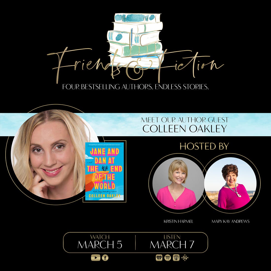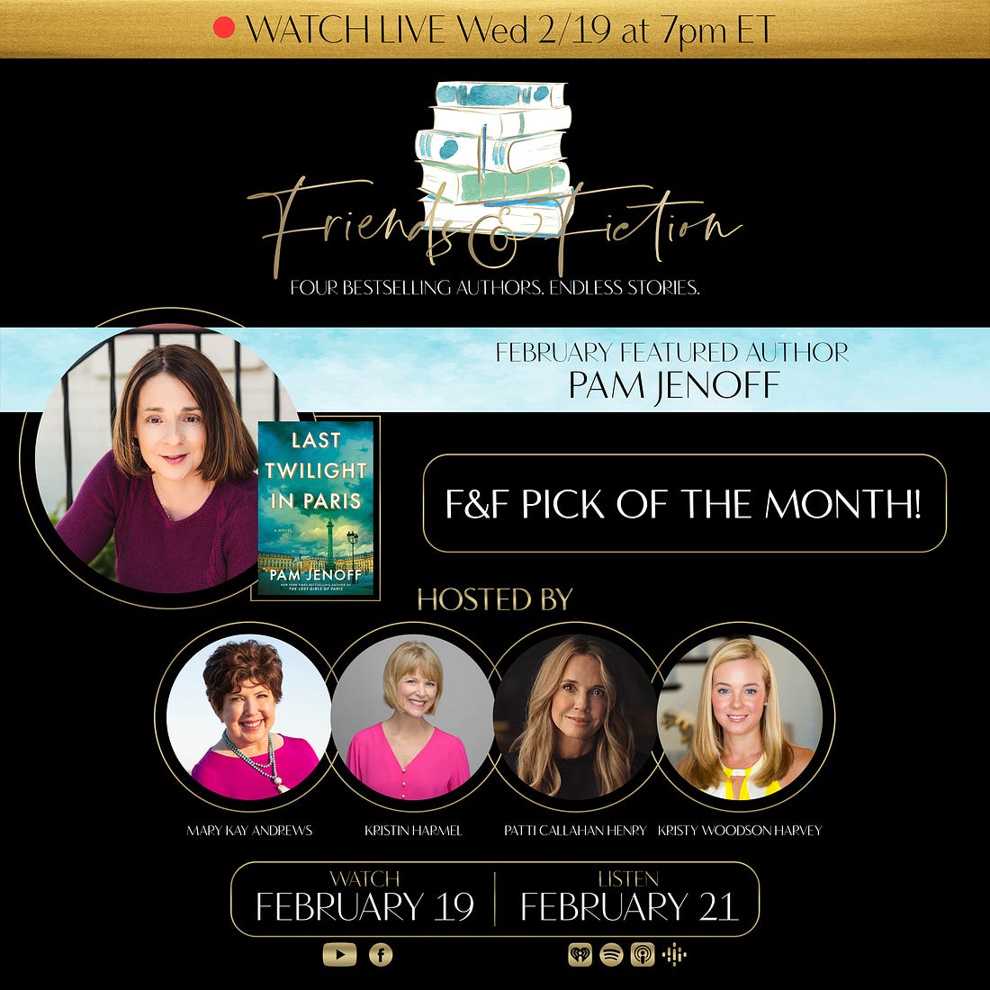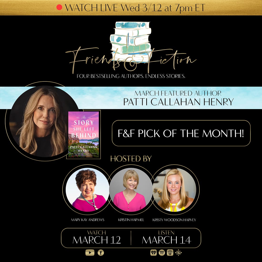 Tune in at 7pm ET for TONIGHT’s episode! Join us Wednesday, March 26th at 7pm Eastern on the F&F Facebook page and YouTube channel as Patti Callahan Henry & Kristy Woodson Harvey welcome New York Times bestselling author Emilia Hart to discuss her latest spellbinding novel, The Sirens, about sisters separated by centuries, but bound together by the sea. An Australia native now living in England, Emilia has worked as a lawyer in Sydney and London. She is the author of the runaway NYT-bestselling debut novel, Weyward. She joins us to discuss her highly anticipated second novel, The Sirens. It’s a breathtaking tale of female resilience and the bonds of sisterhood across time and space, which captures the power of dreams, and the mystery and magic of the sea. Watch the video broadcast of this interview as it airs Wed 3/26 at 7pm ET on the F&F Facebook group page & YouTube channel. Catch the audio version on our podcast Fri 3/28. Order Emilia’s book on Bookshop.org! Upgrade to our PAID Subscription for bonus Q&A’s with our guest authors which include a writing tip, book recommendation, and information about their works-in-progress, plus other great material not covered on the show! Latest News from the Fab Four!PATTI CALLAHAN HENRY has been on the road all week for THE STORY SHE LEFT BEHIND and loving every second of meeting readers, signing books, being with her F&F family and seeing old friends. The F&F gathering in Atlanta started the week with a BANG and she is traveling with Meg Walker through 7 states over the last days and next few. Patti is over the moon grateful for everyone’s love and support during publication week. She is on the road for three more weeks so check HERE if there is somewhere you can see her including a special event with her narrator Julia Whelan in Pasadena, California! Follow along on Instagram and join us on the road. KRISTY WOODSON HARVEY is gearing up BIG TIME for her upcoming tour dates! The official BEACH HOUSE RULES tour begins on May 26, but, between now and then, there are so many chances to catch her in person and virtually, beginning on April 3 with a fun event with Viola Shipman, Annabel Monaghan, and Brendan Slocumb! And tickets are selling quickly for her 10-year author anniversary celebration, on May 5, 2025 with South Park Magazine in Charlotte. She is also so thrilled that BEACH HOUSE RULES got the most magical Publisher’s Weekly review! They said: “Harvey keeps the twists and turns coming with her well-constructed plot, including a shocking development on the charges Bill faces. This first-rate tale is perfect for summer reading.” I’m so honored! KRISTIN HARMEL has some fun news she's excited to share later today, so stay tuned to her social media… She's also hard at work on her 2026 book and is excited to share her tour for THE STOLEN LIFE OF COLETTE MARCEAU soon… hopefully sometime next week! She spent a great weekend celebrating her 11th wedding anniversary with her husband, Jason, at Ravello (the yummy Italian restaurant at the Four Seasons Orlando). MARY KAY ANDREWS enjoyed a fun evening talking baking and cookbooks with her former Atlanta Journal-Constitution colleague Anne Byrn, whom she joined at a Tuesday night signing at Eagle Eye Books in Decatur for Anne’s latest, Baking In the American South. MKA also signed copies of her The Beach House Cookbook. In between events, she’s been working on her novel for summer of ‘26. Fans can catch MKA in New Iberia, LA on April 5, at the Books Along the Teche Literary Festival. Details here. Upgrade to our PAID Subscription for an ongoing series of roundtable discussions and personal essays by the Fab Four about their careers, writing processes, and all things book and publishing related! Upcoming EventsView Patti’s full 2025 book tour for The Story She Left Behind HERE. View Kristy’s full 2025 book tour for Beach House Rules HERE. Want to know what these F&F Live events are all about? Watch this video compilation! Did not find video In Case You Missed ItOn last week’s episode of The Friends & Fiction Show, Ron Block and Kristin Harmel welcomed internationally bestselling author of contemporary and historical fiction, Emma Donoghue, to discuss her latest book, The Paris Express, a sweeping historical novel about an infamous 1895 railway disaster at the Paris Montparnasse train station. You can WATCH that episode on Facebook or YouTube, or LISTEN to it on our podcast. Coming Up on The Friends & Fiction ShowAll shows can be watched on Facebook & YouTube each Wednesday evening at 7pm ET, and listened to on our podcast each Friday, all year long.Already aired: Fiona Davis, The Stolen Queen Already aired: Kate Fagan, The Three Lives of Cate Kay Already aired: F&F January Pick of the Month: Tara Dorabji, Call Her Freedom Already aired: Scott Turow, Presumed Guilty Already aired: Lisa Genova, More or Less Maddy Already aired: Victoria Christopher Murray, Harlem Rhapsody Already aired: Christina Clancy, The Snowbirds Already aired: F&F February Pick of the Month: Pam Jenoff, Last Twilight in Paris Already aired: C.J. Box, Battle Mountain Already aired: Colleen Oakley, Jane and Dan at the End of the World Already aired: F&F March Pick of the Month: Patti Callahan Henry, The Story She Left Behind Already aired: Emma Donoghue, The Paris Express Emilia Hart, The Sirens F&F 2025 Subscription Box with Oxford ExchangeThe 2025 FRIENDS AND FICTION Subscription Box is available for purchase now, exclusively from our friends at Oxford Exchange. This subscription includes three separate shipments: *Optional add-on: A paperback, signed, first edition of SUMMERS AT THE SAINT by Mary Kay Andrews (coming in paperback June 3)! Get your subscription NOW from Oxford Exchange! F&F Merch StoreWe have a Friends & Fiction merch store with t-shirts, sweatshirts, coffee mugs and a book bag on Bonfire. We also have other items like wine tumblers, reading journals, and our original white v-neck logo te