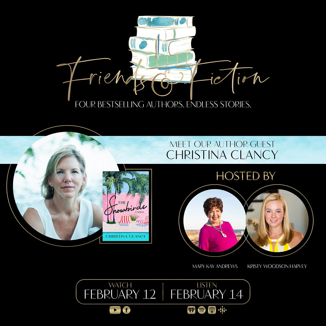 Tune in at 7pm ET for TONIGHT’s episode! Join us Wednesday, February 19th LIVE at 7pm Eastern on the F&F Facebook page and YouTube channel as the Fab Four gather to welcome this month’s F&F Featured Author, Pam Jenoff, to discuss our February 2025 Pick of the Month, the instant New York Times bestseller, Last Twilight in Paris, a riveting novel of love and survival about a Parisian department store, a mysterious necklace, and a woman's quest to unlock a decade-old mystery. Pam Jenoff is the author of several books of historical fiction, including the NYT bestsellers The Lost Girls of Paris and The Woman with the Blue Star. She holds a degree in international affairs from George Washington University and a degree in history from Cambridge, and she earned her J.D. from UPenn. She lives with her husband and three children near Philadelphia, where, in addition to writing, she teaches law school. She joins us to discuss Last Twilight in Paris, “a compelling novel that illuminates a shocking and little-known piece of WWII history—a Parisian store where Jews were imprisoned and forced to sell plunder from Jewish homes” (Lisa Scottoline) — which just debuted on the NYT list at #9 in its first week out. Watch the LIVE video broadcast of this interview as it airs Wed 2/19 at 7pm ET on the F&F Facebook group page & YouTube channel. Catch the audio version on our podcast Fri 2/21. Order Pam’s book on Bookshop.org! Upgrade to our PAID Subscription for bonus Q&A’s with our guest authors which include a writing tip, book recommendation, and information about their works-in-progress, plus other great material not covered on the show! Latest News from the Fab Four!PATTI CALLAHAN HENRY celebrated Valentine’s Day and her wedding anniversary by watching NUMBER ONE Auburn basketball team beat number two Alabama. She also signed over 1,500 books! Yes, that number is right – all to prepare for some of the ways you can get signed first editions of The Story She Left Behind (including the Friends & Fiction subscription box with gift from Oxford Exchange). Her house is covered in boxes, but she is very happy for the mess. We hope you tuned in for her first FB LIVE Behind the Scenes last night – if not, we have three more including a new giveaway every week! Sign up for the next session happening next Tues 2/25 here. You can watch the recording on her FB and Instagram. Did you get her last newsletter with the things that are inspiring her now? Oh, one more thing! Patti’s publisher has one more chance at winning one of 100 galleys of her new book on Goodreads—enter now as this new giveaway closes on Feb 27! KRISTY WOODSON HARVEY celebrated her son‘s undefeated conference champion basketball team on Sunday with a parade… And 35 mile an hour winds and rain. If nothing else, it was memorable! She is heading to her beloved Chapel Hill for about a week for basketball games, board meetings, and general UNC fun. She will also be at Catawba College in Salisbury, NC on February 25th at 11am and would LOVE to see you there! More ticket info here ❤️ Happy reading! KRISTIN HARMEL spent the weekend continuing the celebration for her son Noah’s 9th birthday and catching up on emails and reading. She loved watching the star-studded 50th anniversary special for Saturday Night Live and especially loved the musical performance from Paul McCartney at the end of the show. She’s looking forward to February’s LIVE Friends & Fiction show tonight and hopes to see you all there! Also…. Less than four weeks to go until the release of Patti’s THE STORY SHE LEFT BEHIND!! Have you preordered your copy yet? We can’t wait to celebrate on March’s Friends & Fiction live show in just a few weeks. MARY KAY ANDREWS enjoyed watching granddaughter Molly cheering at a Friday night high school basketball game, then spending time over the weekend with visiting son Andy and his family. Like Kristin, she particularly enjoyed watching the SNL 50th anniversary specials. A great trip down memory lane! Catch MKA this Saturday at the Opelika (Alabama) Book Festival, where she’ll be appearing at 6 p.m. To catch up with her at this and other late winter-early spring events, check her website. Upgrade to our PAID Subscription for an ongoing series of roundtable discussions and personal essays by the Fab Four about their careers, writing processes, and all things book and publishing related! Upcoming EventsSaturday, February 22—MKA in Opelika, AL for the Opelika Book Festival. Details HERE. Tuesday, February 25 at 7pm — Live virtual event hosted by Patti on her Facebook author page. Learn the backstory of her forthcoming novel The Story She Left Behind, ask her anything, and win prizes! She’ll be doing these every Tuesday evening for four straight weeks leading up to her March 18th pub date, with a new topic and a new prize drawing each week. Mark your calendars for the second session in this series on Tues. 2/25! Details HERE. Saturday, March 15 at 6pm — MKA in conversation with Colleen Oakley about Colleen’s new novel Jane and Dan at the End of the World at Gwinnett County Library in Duluth, GA. Info HERE. Monday, March 17 at 6pm — F&F Live in-person event to celebrate the launch of Patti’s The Story She Left Behind at the Atlanta History Center. Save the date! GET TICKETS. View Patti’s full 2025 book tour for The Story She Left Behind HERE. Want to know what these F&F Live events are all about? Watch this video compilation! Did not find video In Case You Missed ItOn last week’s episode of The Friends & Fiction Show, Mary Kay Andrews and Kristy Woodson Harvey welcomed author Christina Clancy to discuss The Snowbirds, her latest page-turning story of a couple who flee winter in the Midwest for Palm Springs, where they find their relationship at a crossroads. You can WATCH that episode on Facebook or YouTube, or LISTEN to it on our podcast. Coming Up on The Friends & Fiction ShowAll shows can be wat