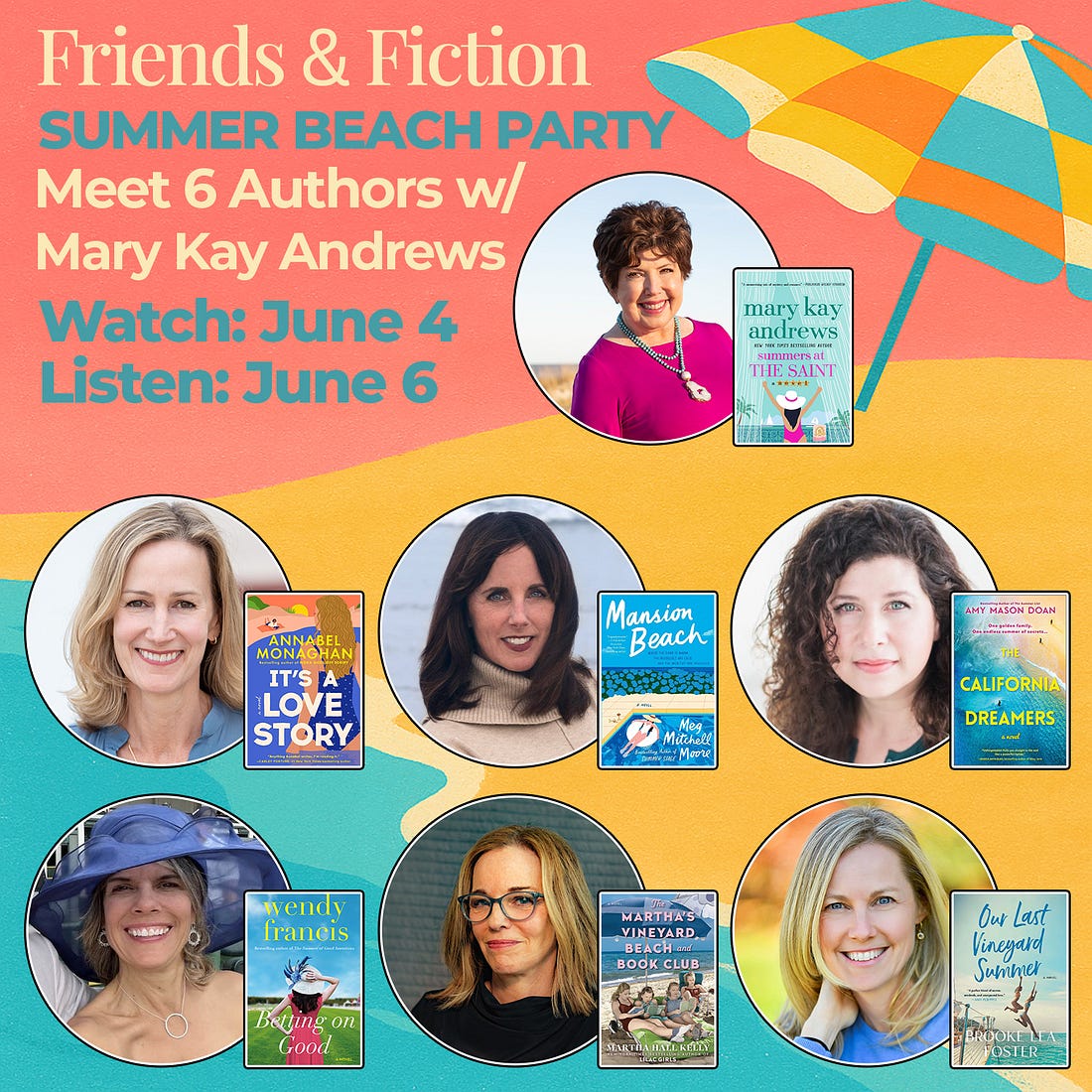 Tune in at 7pm ET for TONIGHT’s episode! Join us Wednesday, June 4th at 7pm Eastern on the F&F Facebook page and YouTube channel as Meg Walker and Mary Kay Andrews welcome 6 author guests, all with new summer reads hitting this season. We have invited Annabel Monaghan, Martha Hall Kelly, Meg Mitchell Moore, Amy Mason Doan, Wendy Francis, and Brooke Lea Foster to join us for a festive kick-off to summer where we’ll learn all about each of their new books, chat about beach reads, and engage in a fun summer-themed lightning round. Annabel Monaghan is the USA Today bestselling and Library Reads Hall of Fame author of Summer Romance, Same Time Next Summer, and Nora Goes Off Script. It’s a Love Story, was released on May 27th. Meg Mitchell Moore is a former journalist and the author of nine novels, including The Arrivals, Two Truths and a Lie, and Vacationland. Mansion Beach was released on May 27th. Martha Hall Kelly is the NYT-bestselling author of Lilac Girls, Lost Roses, Sunflower Sisters, and The Golden Doves. The Martha’s Vineyard Beach and Book Club, was released on May 27th. Wendy Francis is a former book editor and the author of seven novels, including Feels Like Summer, Summertime Guests, and The Summer of Good Intentions. Betting on Good, was released on May 1st. Amy Mason Doan is the bestselling author of The Summer List, Summer Hours, and Lady Sunshine. The California Dreamers was released on April 8th. Brooke Lea Foster is an award-winning journalist and the author of Summer Darlings, On Gin Lane, and All the Summers In Between. Our Last Vineyard Summer, will be released on July 1st. Watch the video broadcast of this super fun kick-off to summer beach party as it airs Wed 6/4 at 7pm ET on the F&F Facebook group page & YouTube channel. Catch the audio version on our podcast Fri 6/6. Order our guests’ books from the F&F Shop on Bookshop.org! Upgrade to our PAID Subscription for bonus Q&A’s with our guest authors which include a writing tip, book recommendation, and information about their works-in-progress, plus other great material not covered on the show! Giveaway!Enter to win all the books by this week’s show guests PLUS Kristy’s Beach House Rules! One lucky winner will walk away with all 8 books! Just fill out the simple entry form and click submit. Entry deadline: Tues 6/10/25. The winner will be chosen at random and announced LIVE on the air on the Wed. June 11th episode of F&F when we gather to celebrate the launch of Kristin Harmel’s The Stolen Life of Colette Marceau. Good luck! Latest News from the Fab Four!PATTI CALLAHAN HENRY has spent the week with her daughter, Meagan and her two little grandgirls helping Meagan through a sickness! She was so sad to miss Kristy’s launch in Myrtle Beach but Patti was there in spirit and she’s already told you: SHE LOVES BEACH HOUSE RULES!! Sometimes there is writing like crazy and sometimes there is immersive family time – and this week has been all about the wild little ones and taking care of her precious daughter. KRISTY WOODSON HARVEY had the most amazing pub week! She is in Dallas TX tonight, Waco TX tomorrow, and Doylestown PA, on June 6th. Thank you so much to everyone who has come to see her on tour so far! There are plenty of tour dates left, be sure to check out her website for the remaining dates! If you have read Beach House Rules, please add your review to Amazon and Goodreads as this is such a BIG help for authors for a book launch! KRISTIN HARMEL loves that she got to hang out with the F&F gang (including many of you!) last week in Myrtle Beach for the launch of Kristy's BEACH HOUSE RULES! Less than two weeks (!) before THE STOLEN LIFE OF COLETTE MARCEAU hits bookstores…. if you want a signed, PERSONALIZED copy, make sure to preorder from my local bookstore (Writer’s Block) by June 16 HERE. MARY KAY ANDREWS loved seeing so many F&F friends last week in Myrtle Beach for the launch of Kristy’s BEACH HOUSE RULES. On Tuesday she celebrated the paperback publication of her New York Times bestselling SUMMERS AT THE SAINT. Now she’s in full-on wedding week mayhem as she and Mr. MKA prepare to host their son Andrew’s wedding—in their backyard. Watch her social media for updates and pics from the big day. Upgrade to our PAID Subscription for an ongoing series of roundtable discussions and personal essays by the Fab Four about their careers, writing processes, and all things book and publishing related! Upcoming EventsView Kristy’s full 2025 book tour for Beach House Rules HERE. View Kristin’s full 2025 book tour for The Stolen Life of Colette Marceau HERE. See Patti’s upcoming events HERE. See MKA’s upcoming events HERE. Tuesday, June 17, 2025—Friends & Fiction Live at the Jersey Shore to celebrate the launch of The Stolen Life of Colette Marceau by Kristin Harmel. Meet all four Friends & Fiction host authors! Hosted by Booktowne at the Algonquin Arts Theatre in Manasquan, NJ. Doors open at 6:00PM. The show begins at 7:00 PM. Tickets are $45 and include a signed copy of The Stolen Life of Colette Marceau, lively keynote presentation delivered by the Fab Four (plus Meg & Ron!), and live audience Q&A session—plus sips & nibbles, meet & greet, book signings, and photo opportunities in the courtyard after the show! Additional books by all four authors will be available for purchase at the event. GET TICKETS! Want to know what our F&F Live events are all about? Watch this video compilation! Did not find video In Case You Missed ItOn last week’s episode of The Friends & Fiction Show, Kristin Harmel & Patti Callahan Henry welcomed New York Times bestselling author Kristina McMorris to discuss her latest work of historical fiction, The Girls of Good Fortune, which shines a light on shocking events surrounding Portland's dark history. You can WATCH that episode on Facebook or YouTube, or LISTEN to it on our podcast. Coming Up on The Friends & Fiction ShowAll shows can be watched on Faceboo