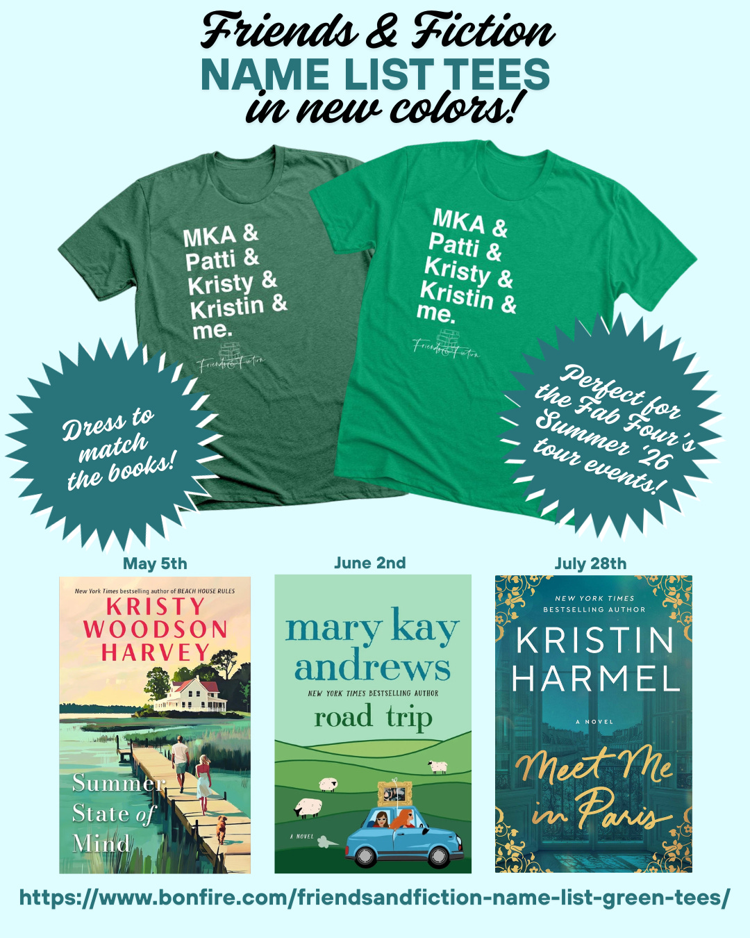 We’ve added TWO NEW COLORS for our fan favorite name list tee-shirts. We now have them in a heathery hunter green and a kelly green—both of which match perfectly with the three new Fab Four books out in May, June & July! Get yours now and dress to match the books when you come out to Kristy, MKA & Kristin’s tour events!