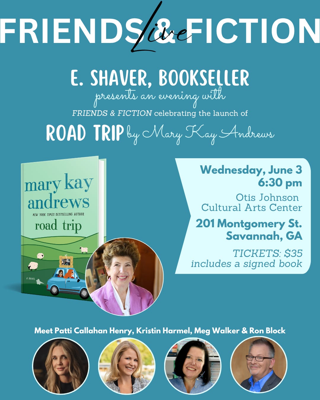 Join us Wednesday, June 3rd for an in-person Friends & Fiction Live event in Savannah to celebrate the launch of MKA’s Road Trip! Get full details and tickets HERE!