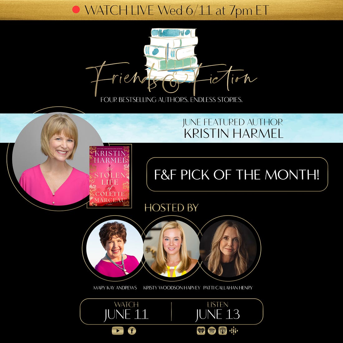 Tune in at 7pm ET for TONIGHT’s episode! Join us Wednesday, June 11th at 7pm Eastern on the F&F Facebook page and YouTube channel as the full F&F family gathers to welcome this month’s F&F Featured Author, New York Times bestselling novelist Kristin Harmel to discuss her electrifying new novel, our June 2025 Pick of the Month, The Stolen Life of Colette Marceau, about two jewel thieves, a priceless bracelet that disappears in 1940s Paris, and a quest for answers in a decades-old murder. Kristin is the New York Times, USA Today, and #1 internationally bestselling author of more than a dozen novels including The Forest of Vanishing Stars, The Book of Lost Names, The Room on Rue Amélie, and The Sweetness of Forgetting. Her books are published in more than thirty languages and are sold all over the world, and many of them have been optioned for film and television. Prior to her first book being published in 2006, Kristin had a long magazine writing career, primarily at PEOPLE magazine, and was a frequent contributor to the national television morning show The Daily Buzz. She joins us from her home in Orlando, Florida before embarking on a 2-week book tour to discuss this “dazzling diamond of a novel” (Hazel Gaynor) that Fiona Davis calls “joyous and ultimately triumphant.” Watch the LIVE video broadcast of this interview as it airs Wed 6/11 at 7pm ET on the F&F Facebook group page & YouTube channel. Catch the audio version on our podcast Fri 6/13. Order Kristin’s book on Bookshop.org! Upgrade to our PAID Subscription for bonus Q&A’s with our guest authors which include a writing tip, book recommendation, and information about their works-in-progress, plus other great material not covered on the show! Latest News from the Fab Four!PATTI CALLAHAN HENRY is so thrilled to celebrate the release of Kristin’s book, The Stolen Life of Colette Marceau, tonight LIVE on our show. She’ll be broadcasting from Nantucket where the book festival begins tomorrow. After a week at home writing and catching up after visiting her daughter and grandbabies, she is ready for a party! Patti has lots of stops in the next couple weeks in Book Tour Part II for THE STORY SHE LEFT BEHIND, and she’d love to see any of you who are near NJ or NYC! KRISTY WOODSON HARVEY is finally home from the first part of her BEACH HOUSE RULES tour! She is enjoying the sunshine and the beach with her favorite boys and loveable dog, Salt! She is overjoyed at the news that People Magazine picked Beach House Rules as a Most Anticipated Summer Read for 2025! She would love to see you on one of her final tour stops for Beach House Rules so make sure to check out where she will be! KRISTIN HARMEL cannot believe there’s LESS THAN A WEEK TO GO BEFORE THE LAUNCH OF HER NEW BOOK! Where has the time gone?? Make sure to check out THE STOLEN LIFE OF COLETTE MARCEAU (coming out Tuesday), preorder your personalized copy by this Monday (6/16) if you’re interested, and find Kristin’s full coast-to-coast tour schedule here. Hope to see you on the road! MARY KAY ANDREWS loved handing out free copies of SUMMERS AT THE SAINT on her paperback publication date last week. She’s still basking in the afterglow of Saturday’s love-filled backyard wedding for Boomerang Boy and his bride Meghan. Check her Instagram and Facebook pages for allll the photos. And now, we return to working on next summer’s book with some events in between. Upgrade to our PAID Subscription for an ongoing series of roundtable discussions and personal essays by the Fab Four about their careers, writing processes, and all things book and publishing related! Upcoming EventsView Kristin’s full 2025 book tour for The Stolen Life of Colette Marceau HERE. View Kristy’s full 2025 book tour for Beach House Rules HERE. See Patti’s upcoming events HERE. See MKA’s upcoming events HERE. Tuesday, June 17, 2025—Friends & Fiction Live at the Jersey Shore to celebrate the launch of The Stolen Life of Colette Marceau by Kristin Harmel. Meet all four Friends & Fiction host authors! Hosted by Booktowne at the Algonquin Arts Theatre in Manasquan, NJ. Doors open at 6:00PM. The show begins at 7:00 PM. Tickets are $45 and include a signed copy of The Stolen Life of Colette Marceau, lively keynote presentation delivered by the Fab Four (plus Meg & Ron!), and live audience Q&A session—plus sips & nibbles, meet & greet, book signings, and photo opportunities in the courtyard after the show! Additional books by all four authors will be available for purchase at the event. GET TICKETS! Want to know what our F&F Live events are all about? Watch this video compilation! Did not find video In Case You Missed ItOn last week’s episode of The Friends & Fiction Show, Meg Walker and Mary Kay Andrews welcomed 6 author guests, all with new summer reads hitting this season. We invited Annabel Monaghan, Martha Hall Kelly, Meg Mitchell Moore, Amy Mason Doan, Wendy Francis, and Brooke Lea Foster to join us for a festive kick-off to summer where we learned all about each of their new books, chat about beach reads, and engage in a fun summer-themed lightning round. You can WATCH that episode on Facebook or YouTube, or LISTEN to it on our podcast. Coming Up on The Friends & Fiction ShowAll shows can be watched on Facebook & YouTube each Wednesday evening at 7pm ET, and listened to on our podcast each Friday, all year long.Already aired: F&F March Pick of the Month: Patti Callahan Henry, The Story She Left Behind Already aired: Emma Donoghue, The Paris Express Already aired: Emilia Hart, The Sirens Already aired: Nita Prose, The Maid’s Secret Already aired: Dolen Perkins-Valdez, Happy Land Already aired: F&F April Pick of the Month—Jeneva Rose, The Perfect Divorce Already aired: Jasmine Guillory, Flirting Lessons Already aired: Carley Fortune, One Golden Summer Already aired: Mary Alice Monroe, Where the Rivers Merge Already aired: Ruth Reichl, The Paris Novel Already aired: F&F May Pic